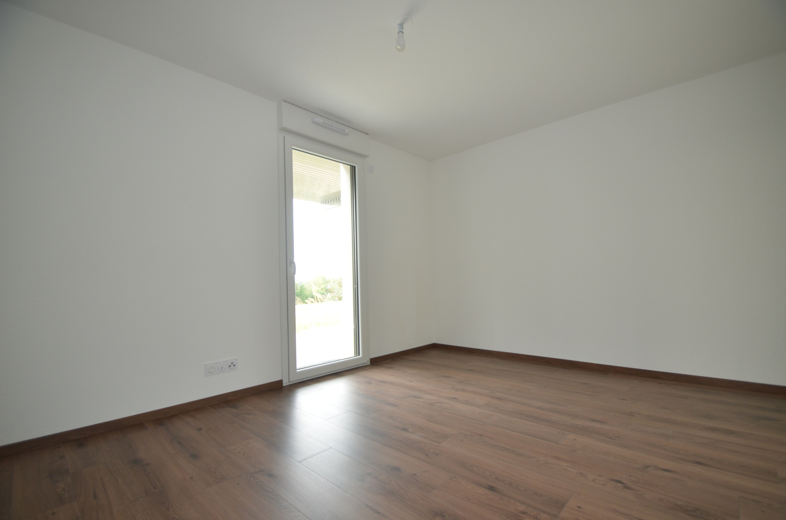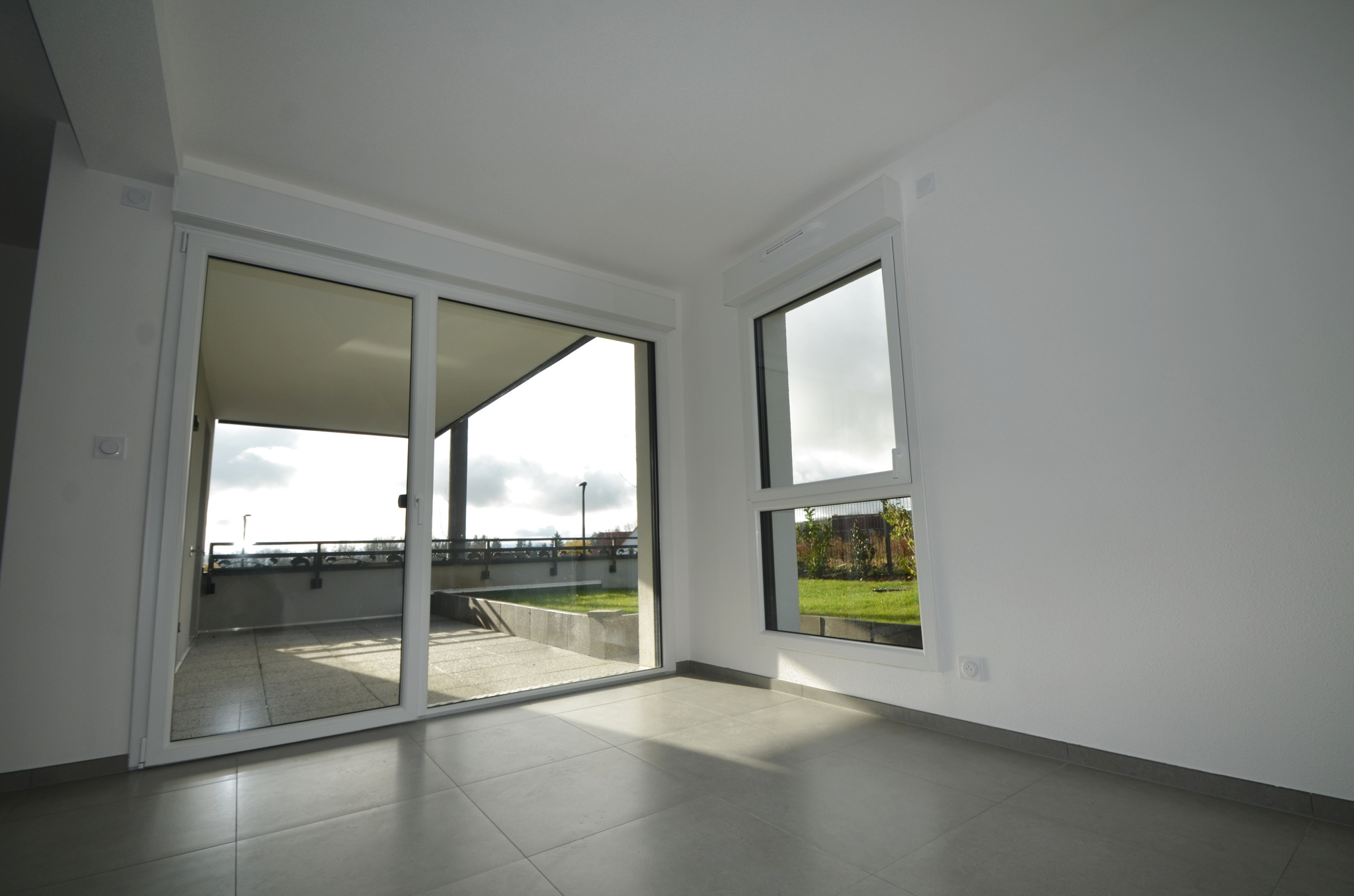 Exemple d'appartement encore libre à la vente: En rez de jardin F3 avec jardin privatif clôturé de 47 m2 et terrasse de 14 m2 orientée ouest à 254000 €.