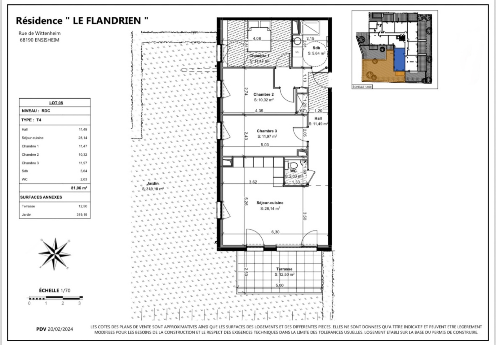4 pièces à 308 000€ avec terrasse de 12,50m2 et jardin privatif de 3 ares. Orientation sud-ouest.
