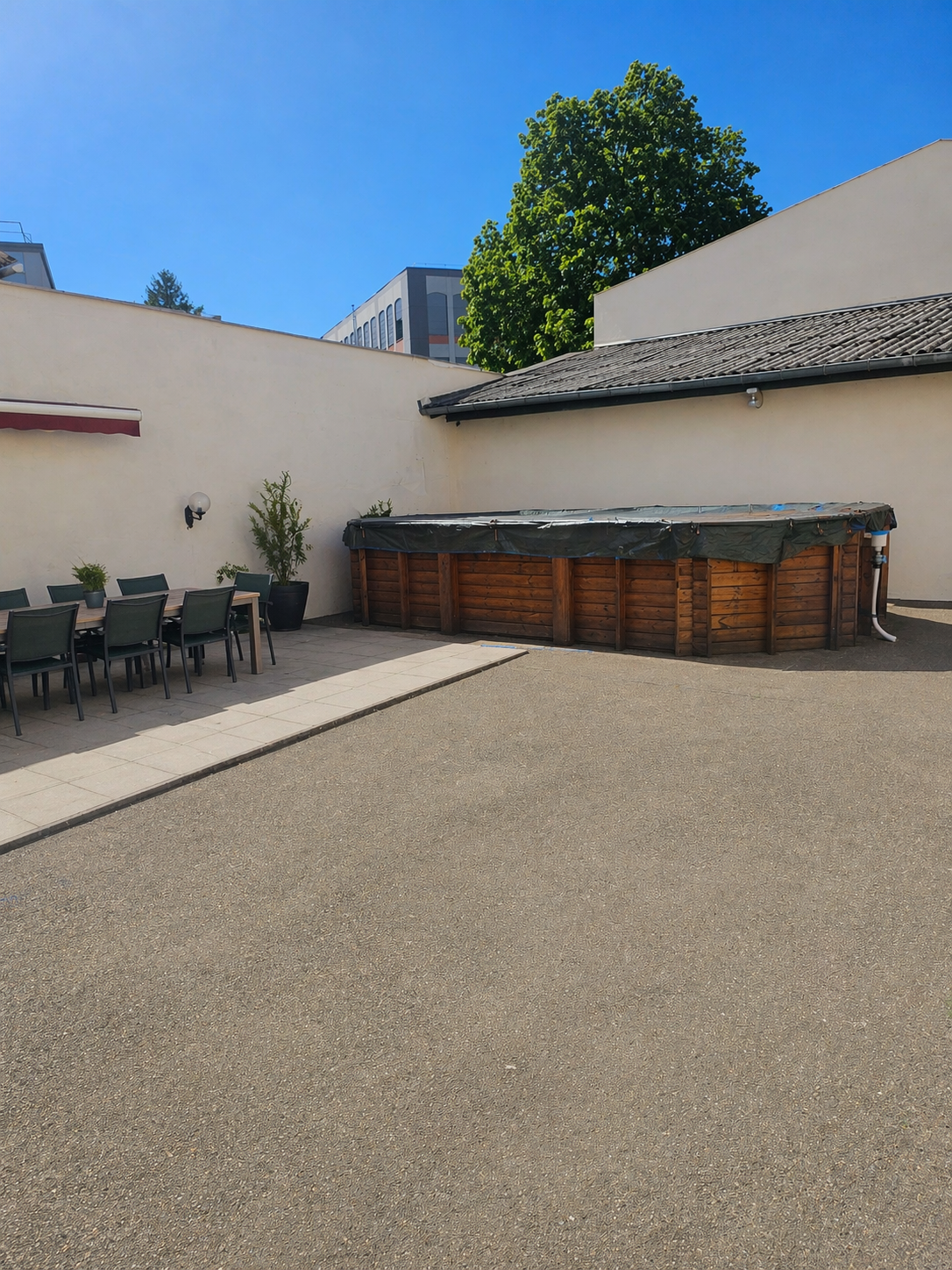 A l'extérieur, une grande cour avec une piscine hors sol, 4 garages avec grenier, un bureau ( idéale pour du professionel).
