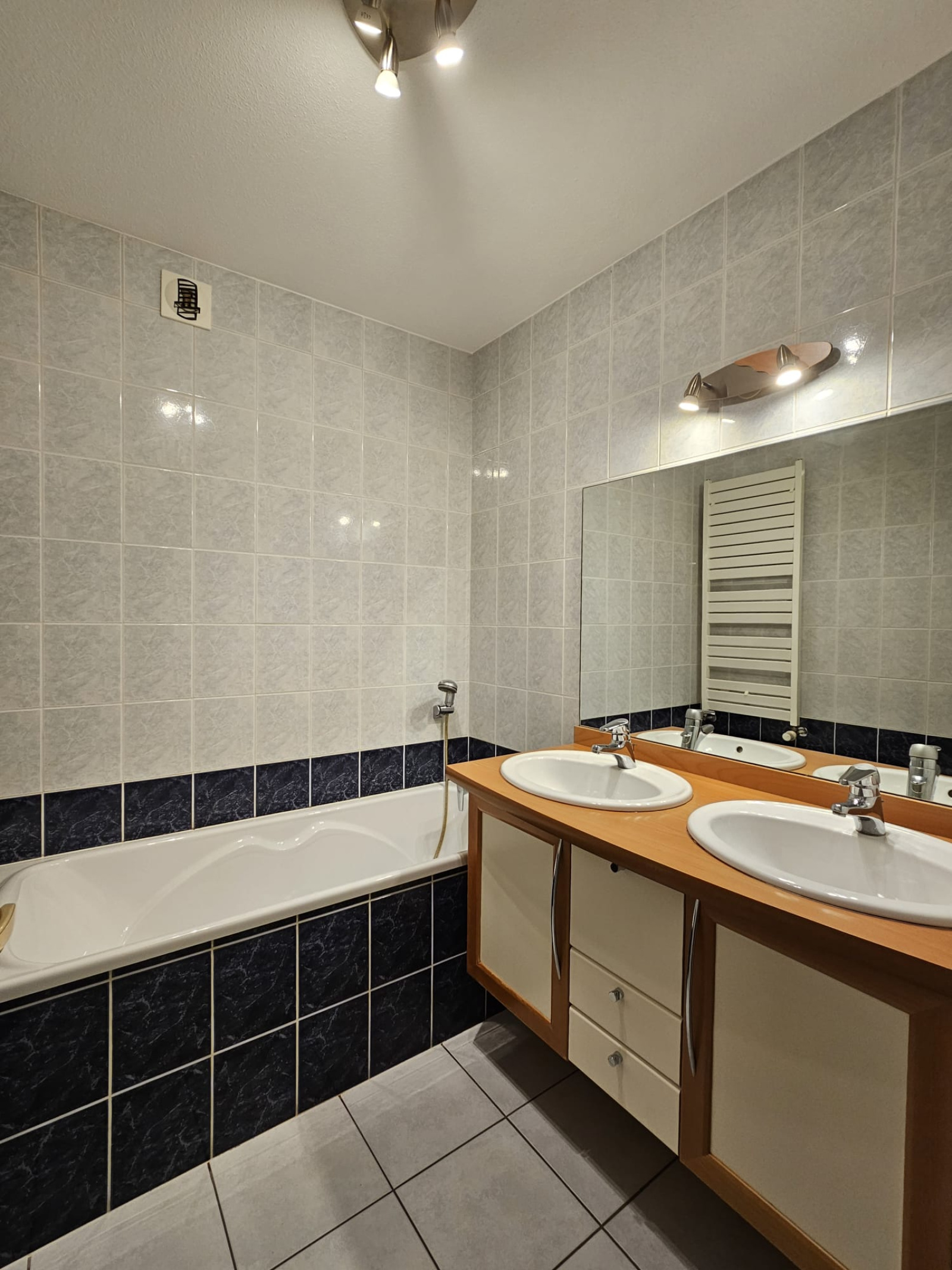 L'appartement est composé d'un séjour d'environ 30m² et d'une cuisine équipée qui accèdent tous deux à la terrasse; 2 chambres confortables dont une avec un placard de rangement ( 13.50m² et 11m²), une salle de bains aménagée d'un meuble double vasque et une baignoire, un wc séparé. Possibilité de créer une 3ème chambre à coucher.