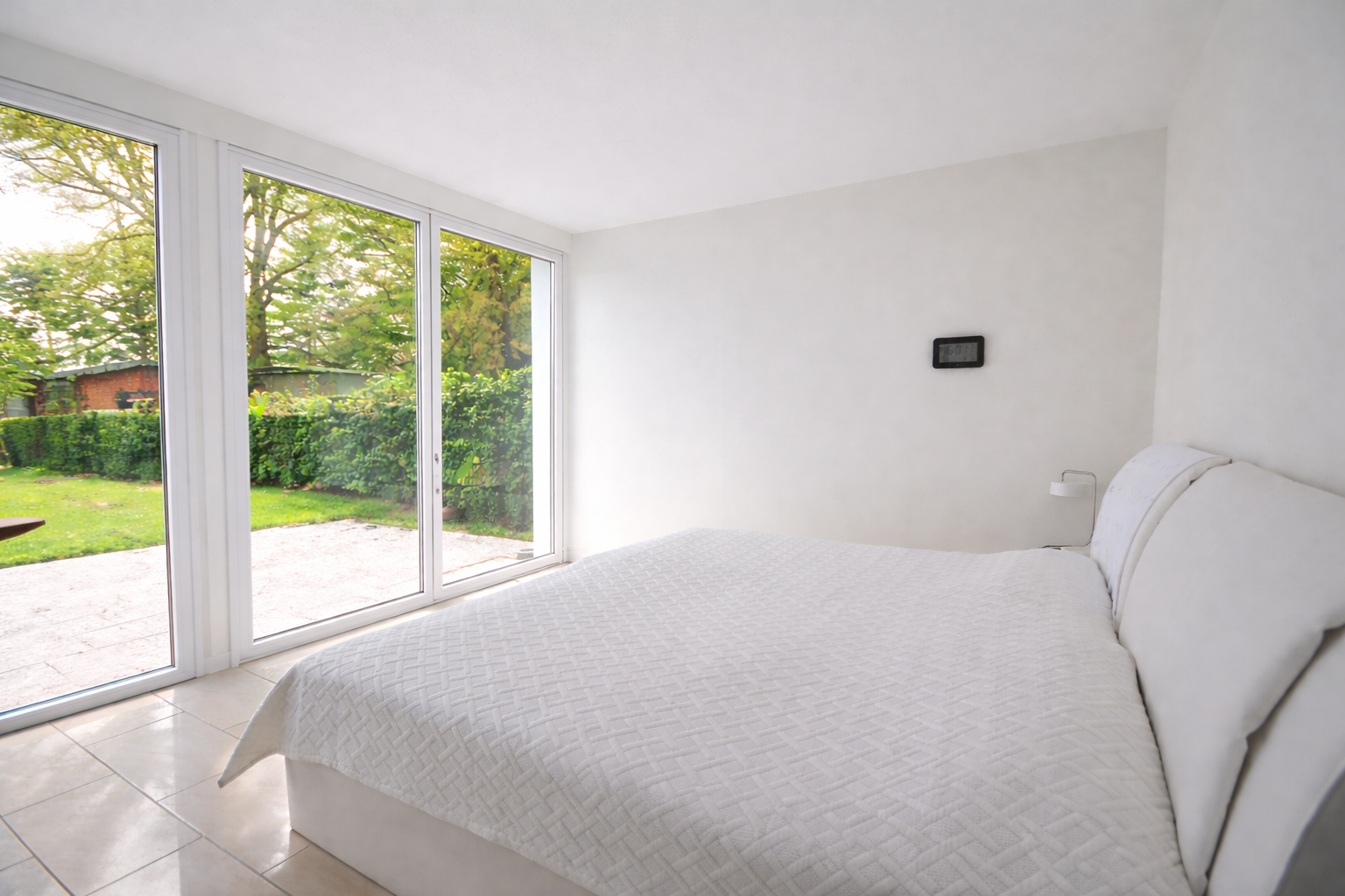 3 chambres avec baie vitrées (accès terrasse), une salle de bains avec wc, à l'extérieur une grande terrasse,un jardin plat,sur l'avant un parking 3 places.