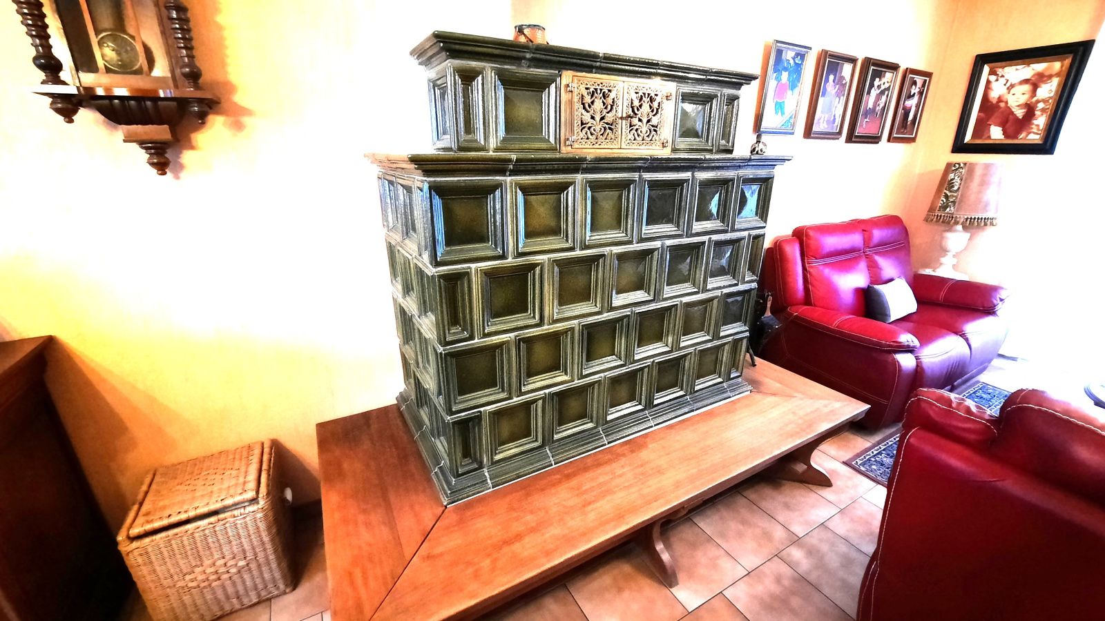 Le chauffage : Dans le salon/salle à manger le chauffage principale est au bois, un "Kachelhofen" complété par un chauffage électrique.